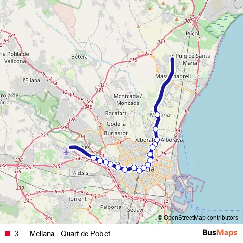 The first stop of the 3 tram route is Meliana and the last stop is Quart de Poblet. 3 (Meliana - Quart de Poblet) is operational during everyday.