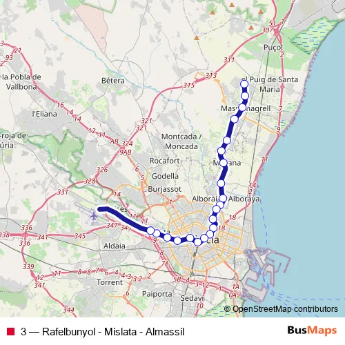 The first stop of the 3 metro route is Rafelbunyol and the last stop is Mislata Almassil. 3 (Rafelbunyol - Mislata - Almassil) is operational during everyday.