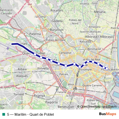 The first stop of the 5 tram route is Marítim and the last stop is Quart de Poblet. 5 (Marítim - Quart de Poblet) is operational during everyday.