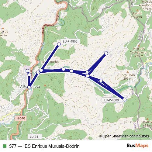 The first stop of the 577 bus route is Dodrín and the last stop is IES Enrique Muruais. 577 (IES Enrique Muruais-Dodrín) is operational during on weekdays.