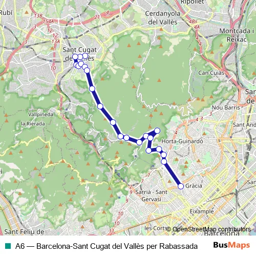 The first stop of the A6 bus route is rbla. Celler - c. Sant Medir and the last stop is pl. Lesseps (Riera de Cassoles). A6 (Barcelona-Sant Cugat del Vallès per Rabassada) is operational during on weekdays.