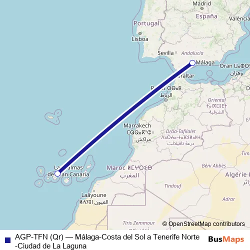 The first stop of the AGP-TFN (Qr) air route is Aeropuerto Málaga-Costa del Sol and the last stop is Aeropuerto Tenerife Norte-Ciudad de La Laguna. AGP-TFN (Qr) (Málaga-Costa del Sol a Tenerife Norte-Ciudad de La Laguna) is operational during everyday.