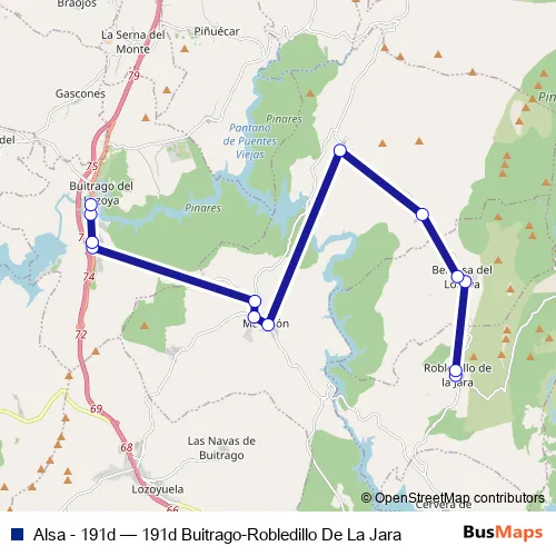 The first stop of the Alsa - 191d bus route is Robledillo De La Jara and the last stop is Buitrago - Terminal Autobuses. Alsa - 191d (191d Buitrago-Robledillo De La Jara) is operational during everyday.