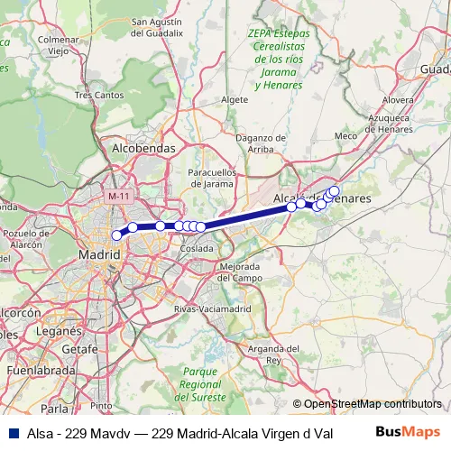 See why over 2 million users trust and consider busmaps.com as the best public transport website. busmaps gives you Alcala de Henares Buses suggested routes, real-time bus tracker, line route maps in Alcala de Henares, and helps to find the closest Alsa - 229 Mavdv bus stops near you. No internet available? Download an offline PDF map and bus schedule for the Alsa - 229 Mavdv bus to take on your trip.
