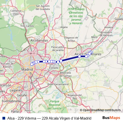 See why over 2 million users trust and consider busmaps.com as the best public transport website. busmaps gives you Madrid Buses suggested routes, real-time bus tracker, line route maps in Madrid, and helps to find the closest Alsa - 229 Vdvma bus stops near you. No internet available? Download an offline PDF map and bus schedule for the Alsa - 229 Vdvma bus to take on your trip.