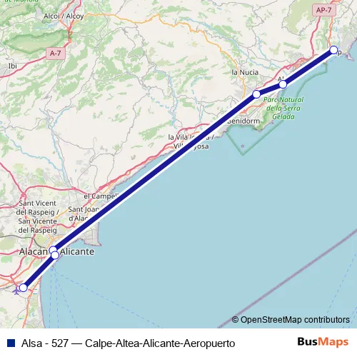 The first stop of the Alsa - 527 bus route is Calpe and the last stop is Alicante Aeropuerto. Alsa - 527 (Calpe-Altea-Alicante-Aeropuerto) is operational during everyday.