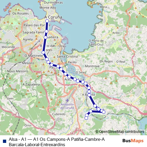 The first stop of the Alsa - A1 bus route is Os Campons (H.Alba) and the last stop is Entrexardins. Alsa - A1 (A1 Os Campons-A Patiña-Cambre-A Barcala-Laboral-Entrexardíns) is operational during everyday.