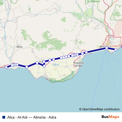 The first stop of the Alsa - Al-Adr bus route is Almeria and the last stop is Adra. Alsa - Al-Adr (Almeria - Adra) is operational during everyday.
