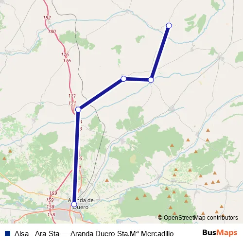 The first stop of the Alsa - Ara-Sta bus route is Aranda De Duero and the last stop is Sta. Maria Del Mercadillo. Alsa - Ara-Sta (Aranda Duero-Sta.Mª Mercadillo) is operational during everyday.
