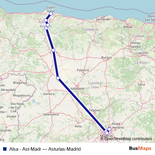The first stop of the Alsa - Ast-Madr bus route is Gijón/Xixón and the last stop is