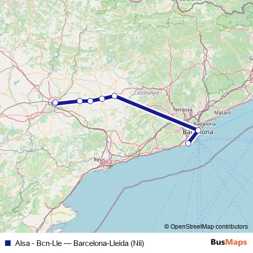 The first stop of the Alsa - Bcn-Lle bus route is Aeropuerto Barcelona- Prat T1 and the last stop is Lleida. Alsa - Bcn-Lle (Barcelona-Lleida (Nii)) is operational during everyday.