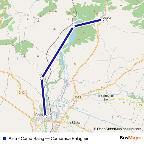 The first stop of the Alsa - Cama Balag bus route is Camarasa and the last stop is Balaguer. Alsa - Cama Balag (Camarasa Balaguer) is operational during everyday.