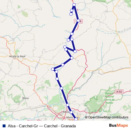 The first stop of the Alsa - Carchel-Gr bus route is Carchel and the last stop is Granada Estación de Autobuses. Alsa - Carchel-Gr (Carchel - Granada) is operational during everyday.