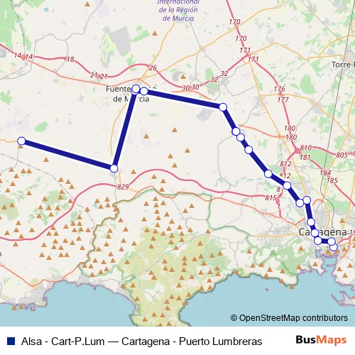 See why over 2 million users trust and consider busmaps.com as the best public transport website. busmaps gives you Fuente-Alamo de Murcia Buses suggested routes, real-time bus tracker, line route maps in Fuente-Alamo de Murcia, and helps to find the closest Alsa - Cart-P.Lum bus stops near you. No internet available? Download an offline PDF map and bus schedule for the Alsa - Cart-P.Lum bus to take on your trip.