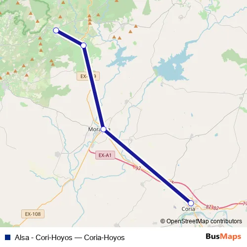 The first stop of the Alsa - Cori-Hoyos bus route is Coria and the last stop is Hoyos. Alsa - Cori-Hoyos (Coria-Hoyos) is operational during on weekdays.