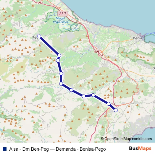 The first stop of the Alsa - Dm Ben-Peg bus route is Benissa and the last stop is Pego. Alsa - Dm Ben-Peg (Demanda - Benisa-Pego) is operational during on weekdays.