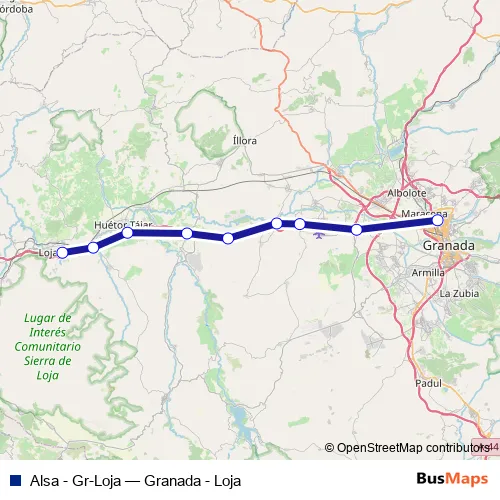 The first stop of the Alsa - Gr-Loja bus route is Granada Estación de Autobuses and the last stop is Loja (Intercambiador). Alsa - Gr-Loja (Granada - Loja) is operational during everyday.