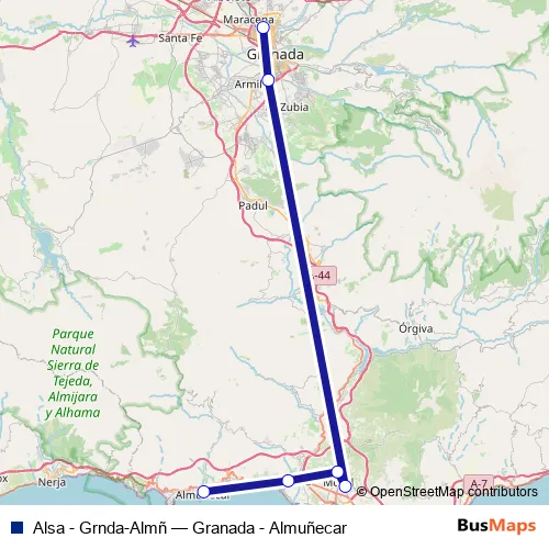 The first stop of the Alsa - Grnda-Almñ bus route is Granada Estación de Autobuses and the last stop is Almuñecar. Alsa - Grnda-Almñ (Granada - Almuñecar) is operational during everyday.
