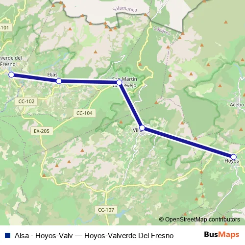 The first stop of the Alsa - Hoyos-Valv bus route is Hoyos and the last stop is Valverde Del Fresno. Alsa - Hoyos-Valv (Hoyos-Valverde Del Fresno) is operational during everyday.