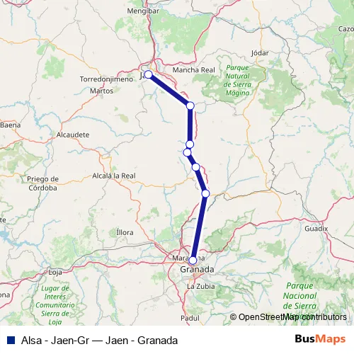 The first stop of the Alsa - Jaen-Gr bus route is Jaen and the last stop is Granada Estación de Autobuses. Alsa - Jaen-Gr (Jaen - Granada) is operational during everyday.