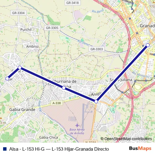 See why over 2 million users trust and consider busmaps.com as the best public transport website. busmaps gives you Churriana de la Vega Buses suggested routes, real-time bus tracker, line route maps in Churriana de la Vega, and helps to find the closest Alsa - L-153 Hi-G bus stops near you. No internet available? Download an offline PDF map and bus schedule for the Alsa - L-153 Hi-G bus to take on your trip.