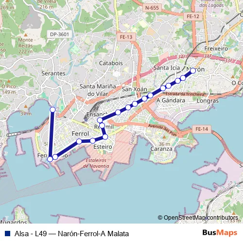 The first stop of the Alsa - L49 bus route is Estadio Malata and the last stop is Concello De Narón. Alsa - L49 (Narón-Ferrol-A Malata) is operational during everyday.