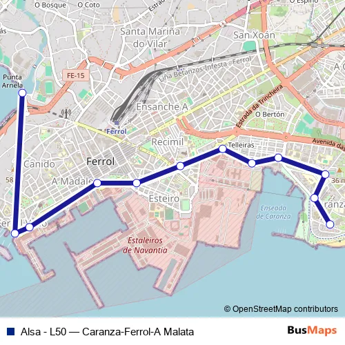 The first stop of the Alsa - L50 bus route is Caranza and the last stop is Estadio Malata. Alsa - L50 (Caranza-Ferrol-A Malata) is operational during everyday.
