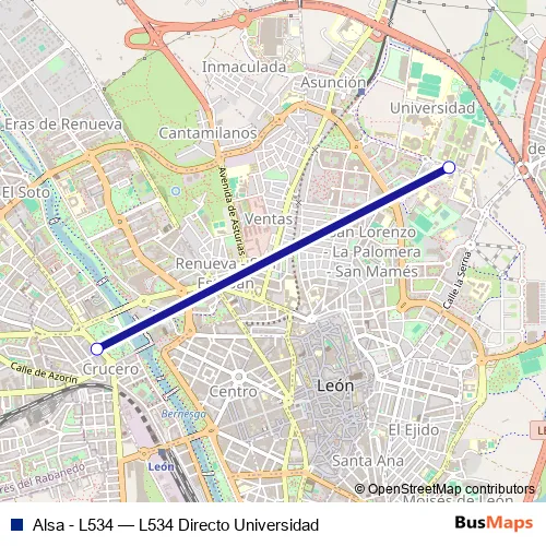 The first stop of the Alsa - L534 bus route is Avda. Magdalena 9 and the last stop is Universidad Leon (Biblioteca). Alsa - L534 (L534 Directo Universidad) is operational during everyday.