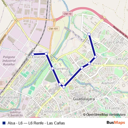 The first stop of the Alsa - L6 bus route is Av.Aguas Vivas. Sentido Renfe and the last stop is Recinto De Renfe. Alsa - L6 (L6 Renfe - Las Cañas) is operational during everyday.