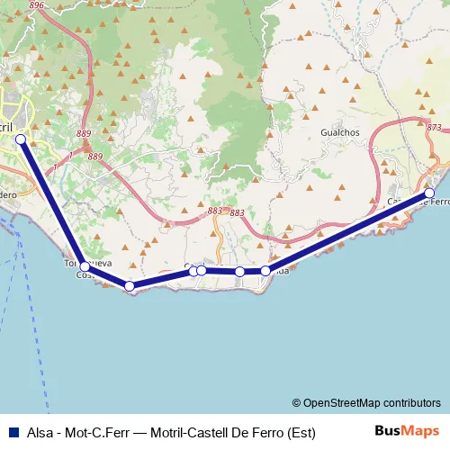 The first stop of the Alsa - Mot-C.Ferr bus route is Motril Estación de Autobuses and the last stop is Castell De Ferro. Alsa - Mot-C.Ferr (Motril-Castell De Ferro (Est)) is operational during everyday.