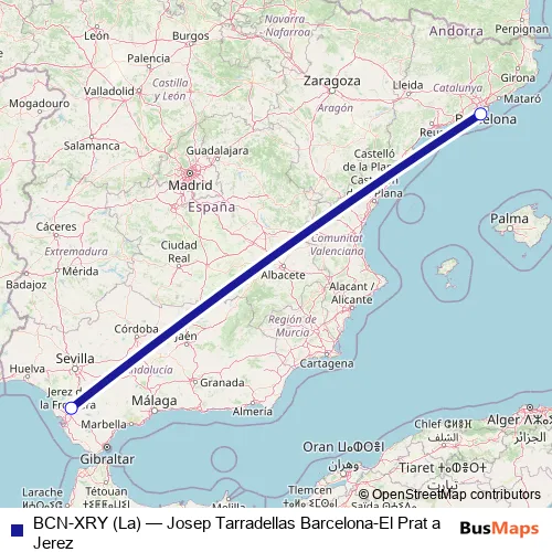 The first stop of the BCN-XRY (La) air route is Aeropuerto Josep Tarradellas Barcelona-El Prat and the last stop is Aeropuerto Jerez. BCN-XRY (La) (Josep Tarradellas Barcelona-El Prat a Jerez) is operational during everyday.
