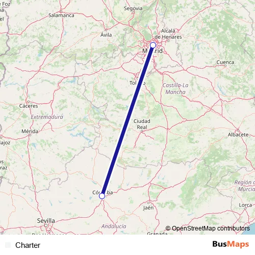 The first stop of the Charter rail route is Madrid Pta.Atocha - Almudena Grandes and the last stop is