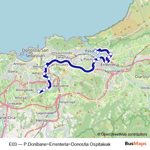 Bus E03 - P.Donibane>Errenteria>Donostia Ospitaleak: Full Schedule in San Sebastian