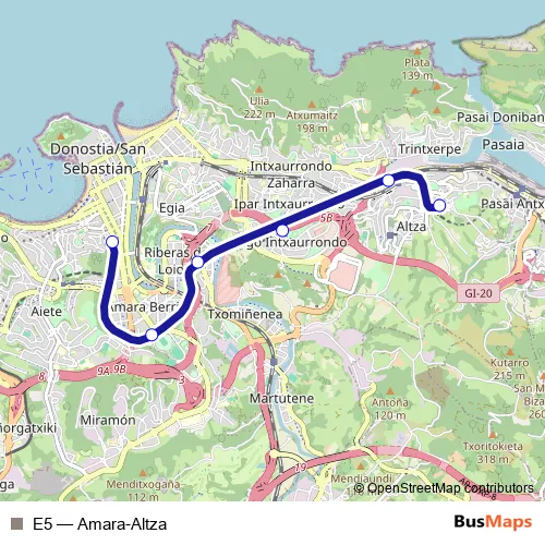 The first stop of the E5 rail route is Amara-Donostia and the last stop is Altza-Donostia. E5 (Amara-Altza) is operational during everyday.