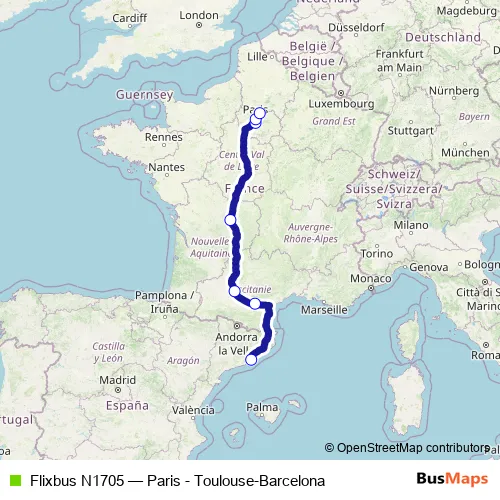 Bus Flixbus N1705 - Paris - Toulouse-Barcelona: Full Schedule in Paris