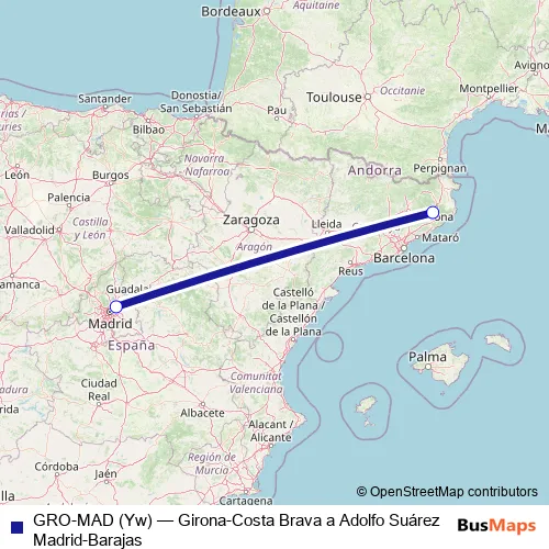 The first stop of the GRO-MAD (Yw) air route is Aeropuerto Girona-Costa Brava and the last stop is Aeropuerto Adolfo Suárez Madrid-Barajas. GRO-MAD (Yw) (Girona-Costa Brava a Adolfo Suárez Madrid-Barajas) is operational during everyday.