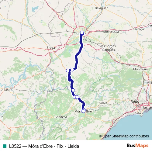 The first stop of the L0522 bus route is Estació d'autobusos de Lleida and the last stop is Móra d'Ebre (estació d'autobusos). L0522 (Móra d'Ebre - Flix - Lleida) is operational during on weekdays.