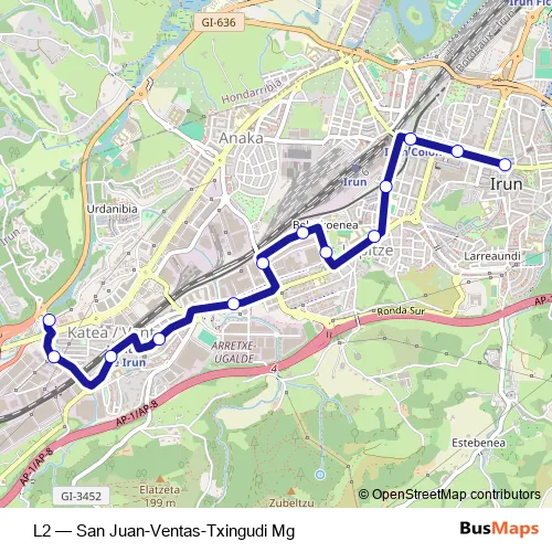 See why over 2 million users trust and consider busmaps.com as the best public transport website. busmaps gives you Irun Buses suggested routes, real-time bus tracker, line route maps in Irun, and helps to find the closest L2 bus stops near you. No internet available? Download an offline PDF map and bus schedule for the L2 bus to take on your trip.