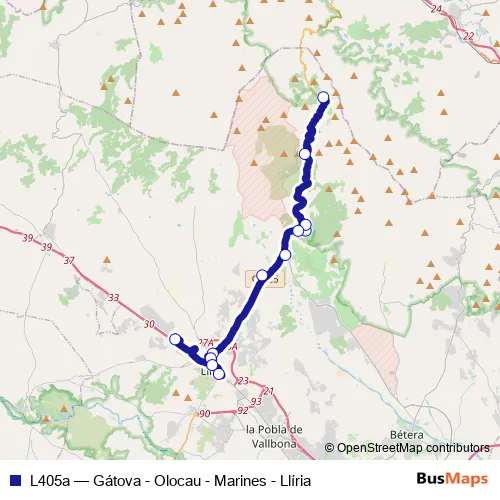 The first stop of the L405a bus route is C/Marines 39 [Gátova] and the last stop is Hospital De Llíria [Llíria]. L405a (Gátova - Olocau - Marines - Llíria) is operational during everyday.