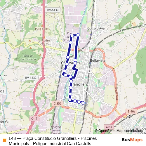 Click here to view the nearest L43 - Plaça Constitució Granollers - Piscines Municipals - Polígon Industrial Can Castells bus stop.
