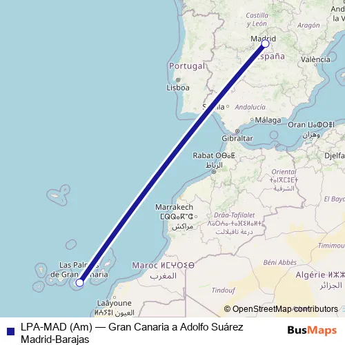 The first stop of the LPA-MAD (Am) air route is Aeropuerto Gran Canaria and the last stop is Aeropuerto Adolfo Suárez Madrid-Barajas. LPA-MAD (Am) (Gran Canaria a Adolfo Suárez Madrid-Barajas) is operational during everyday.