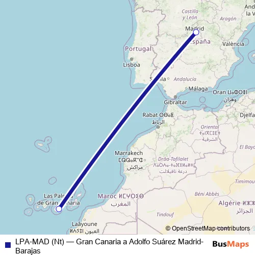 The first stop of the LPA-MAD (Nt) air route is Aeropuerto Gran Canaria and the last stop is Aeropuerto Adolfo Suárez Madrid-Barajas. LPA-MAD (Nt) (Gran Canaria a Adolfo Suárez Madrid-Barajas) is operational during everyday.