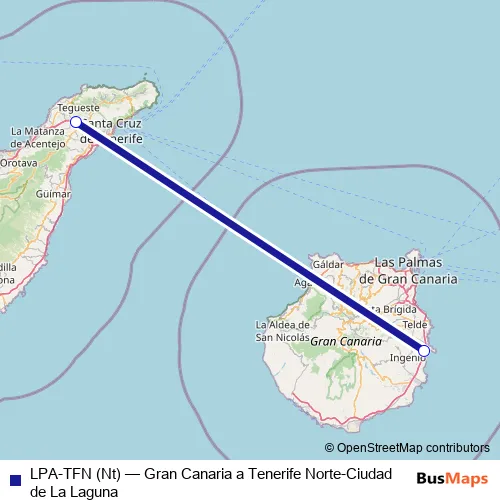 The first stop of the LPA-TFN (Nt) air route is Aeropuerto Gran Canaria and the last stop is Aeropuerto Tenerife Norte-Ciudad de La Laguna. LPA-TFN (Nt) (Gran Canaria a Tenerife Norte-Ciudad de La Laguna) is operational during everyday.