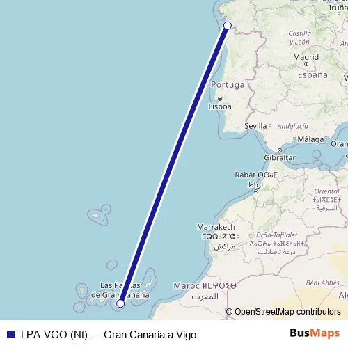 The first stop of the LPA-VGO (Nt) air route is Aeropuerto Gran Canaria and the last stop is Aeropuerto Vigo. LPA-VGO (Nt) (Gran Canaria a Vigo) is operational during everyday.