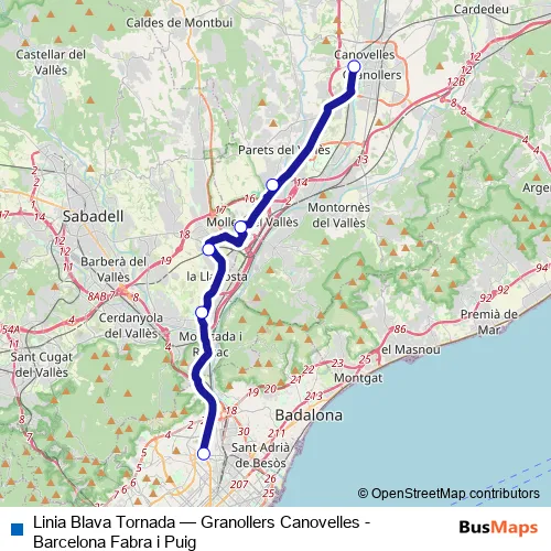 The first stop of the Linia Blava Tornada bus route is Granollers-Canovelles and the last stop is Fabra i Puig. Linia Blava Tornada (Granollers Canovelles - Barcelona Fabra i Puig) is operational during everyday.