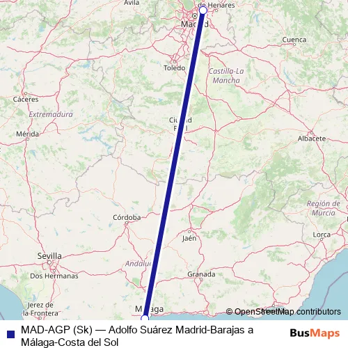The first stop of the MAD-AGP (Sk) air route is Aeropuerto Adolfo Suárez Madrid-Barajas and the last stop is Aeropuerto Málaga-Costa del Sol. MAD-AGP (Sk) (Adolfo Suárez Madrid-Barajas a Málaga-Costa del Sol) is operational during everyday.