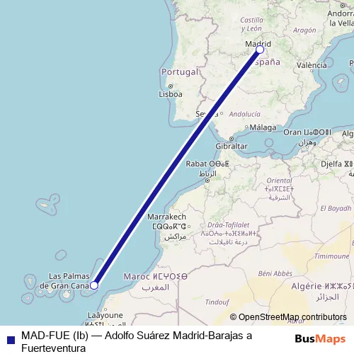 The first stop of the MAD-FUE (Ib) air route is Aeropuerto Adolfo Suárez Madrid-Barajas and the last stop is Aeropuerto Fuerteventura. MAD-FUE (Ib) (Adolfo Suárez Madrid-Barajas a Fuerteventura) is operational during everyday.