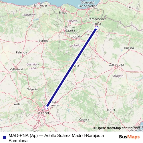 The first stop of the MAD-PNA (Ap) air route is Aeropuerto Adolfo Suárez Madrid-Barajas and the last stop is Aeropuerto Pamplona. MAD-PNA (Ap) (Adolfo Suárez Madrid-Barajas a Pamplona) is operational during everyday.