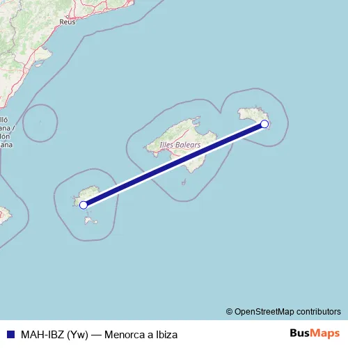 The first stop of the MAH-IBZ (Yw) air route is Aeropuerto Menorca and the last stop is
