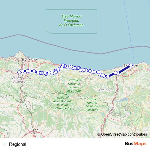 The first stop of the Regional rail route is Santander and the last stop is Oviedo/Uviéu. Regional is operational during everyday.